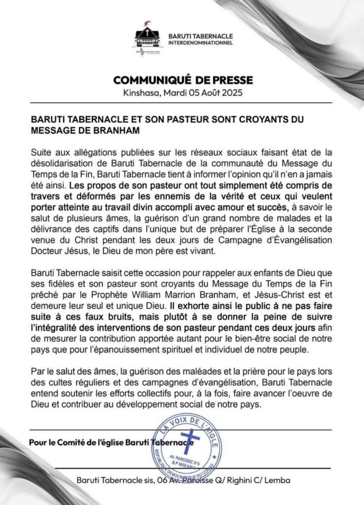 L’église Baruti Tabernacle Interdenominationnel a formellement démenti, dans un communiqué rendu public ce mardi 06 août, toute désolidarisation de son pasteur et de la communauté avec le Message du Temps de la Fin, tel que prêché par le prophète William Marrion Branham. Cette mise au point intervient après la diffusion sur les réseaux sociaux de rumeurs affirmant une prétendue rupture entre l’église et le fondement doctrinal de son engagement spirituel.
